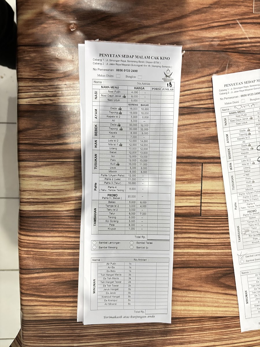 Ordering is simple and efficient: select your dishes at the counter via a paper menu, then enjoy your meal with a relaxed payment process. This balance of flavor, service, and atmosphere makes Penyetan Cak Kino Simongan a must-visit for anyone seeking authentic Indonesian comfort food in Semarang.